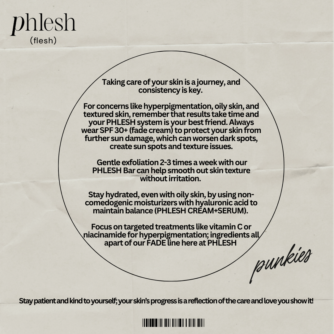 This client wanted to achieve smooth, glowing skin, but struggled with excess oil in the T-zone, frequent breakouts, and acne scars that left her skin looking uneven and textured.Her biggest challenge was balancing her oily forehead, nose, and chin, while fading dark marks and maintaining hydration without triggering new blemishes.She began a targeted skincare routine using: Phlesh Kojic Acid & Goat’s Milk Bar to deeply cleanse, reduce excess sebum, and gently fade scars Brightening Fade Cream to even tone, support skin renewal, and heal acne-related discoloration